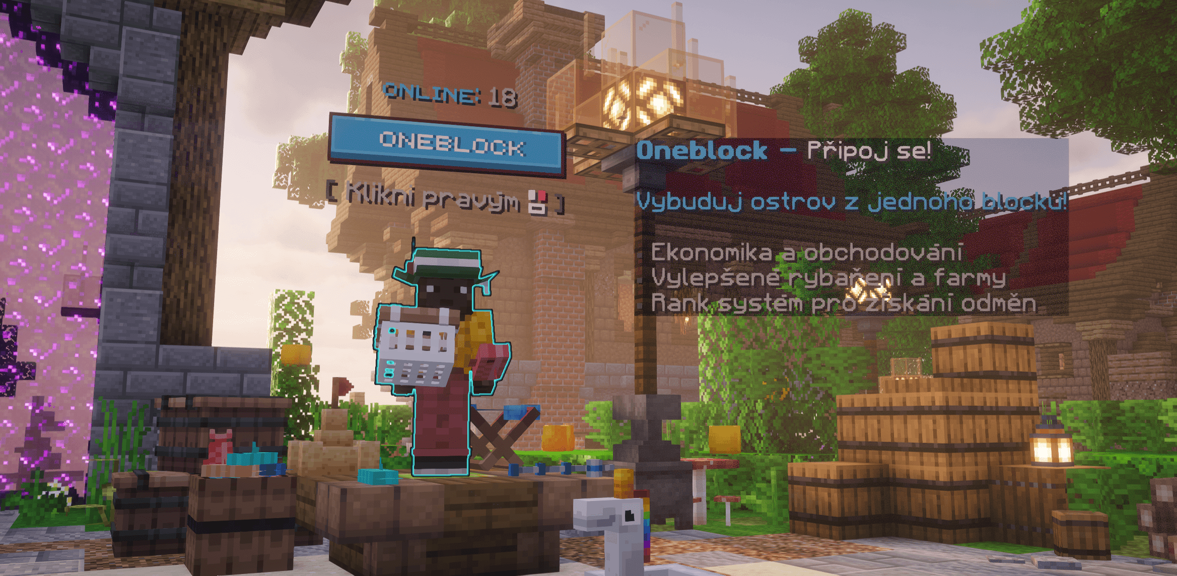 OneBlock je mladší bratr našeho Survivalu – herní mód, který dává každému hráči naprosto stejný start. Stojíš na jediném bloku ve vzduchu… a zbytek světa si musíš vytvořit sám.